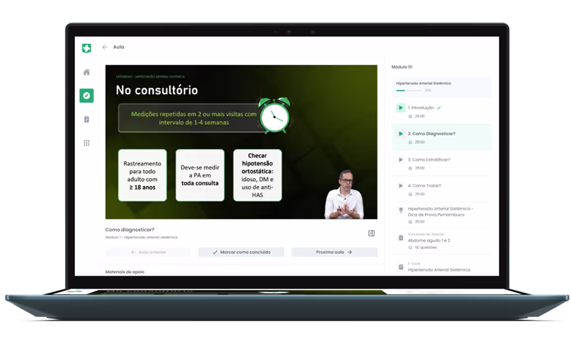Aplicamos métodos ativos como resolução de questões com raciocínio clínico e revisões espaçadas, o que aumenta a retenção de conteúdo e aprimora sua performance.