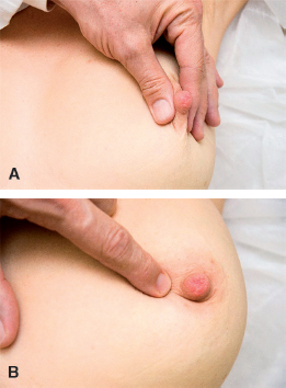Finaliza-se o exame das mamas procurando a expressão papilar, em busca de presença de secreções serosas, lácteas ou sanguinolentas.