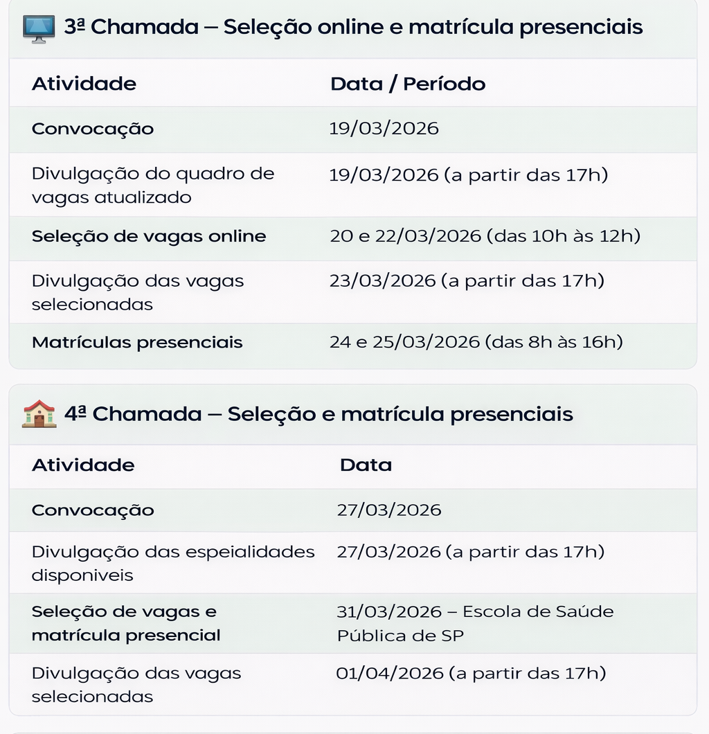 Na 4ª chamada, serão divulgadas apenas as especialidades com vagas remanescentes, sem detalhamento de instituições ou quantitativos, com o objetivo de ampliar as chances de preenchimento das vagas restantes.